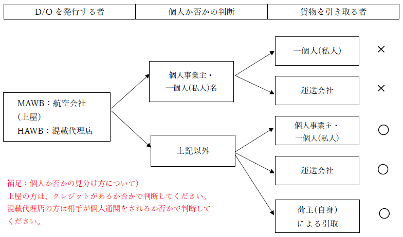 個人通関とは、通関業者でない者(個人事業主、並びに一個人(私人))が通関を行う場合を指します。個人通関はKIX Cargo Cloud対象外になります。下記、〇に該当するものがKIX Cargo Cloud 対象になります。