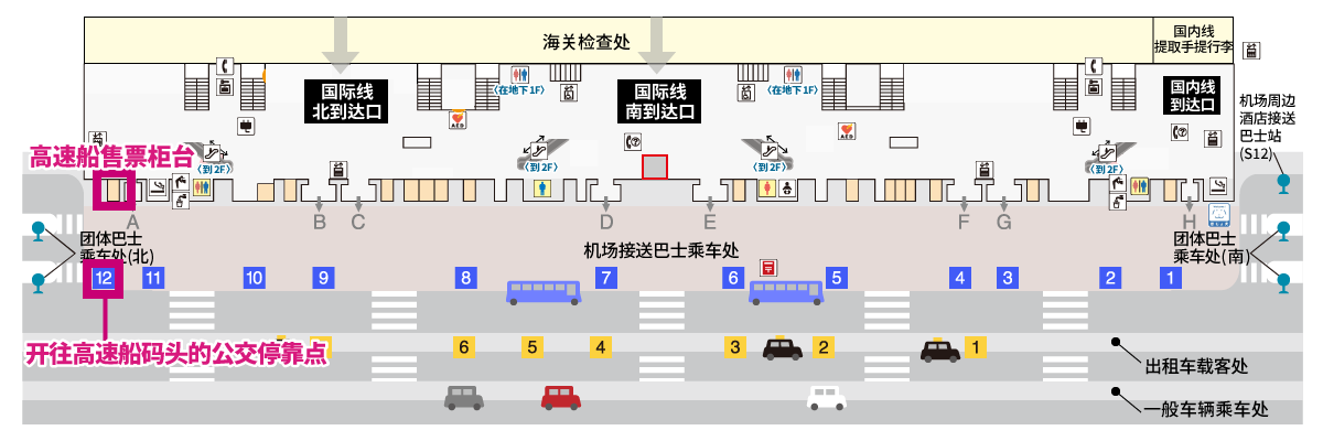专用接驳巴士于第1航站楼及第2航站楼上下车、欲接送乘船旅客的贵宾请至航站大楼。