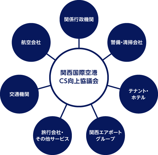 企業や行政機関といった業種の垣根を越え、「お客様第一主義」を合い言葉に、空港内のさまざまな団体や組織が互いに連携してCS(お客様満足)向上に取り組むための組織「関西国際空港CS向上協議会」が、平成15年12月12日に発足しました。