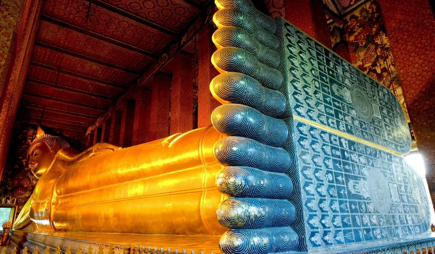 ワット・ポーは、ラマ1世が僧侶が法を学ぶために建てた王宮寺院です。ラマ3世によって造立された全長約46m、高さ約15mの黄金の涅槃仏(ねはんぶつ)で有名なスポット。
