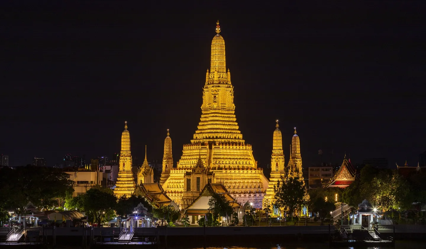 この寺院はアユタヤ時代に建立され、日本では「暁の寺」と呼ばれています 。夜間にライトアップされる美しいシンボル大仏塔は、チャオプラヤーナイトリバークルーズの名所です。