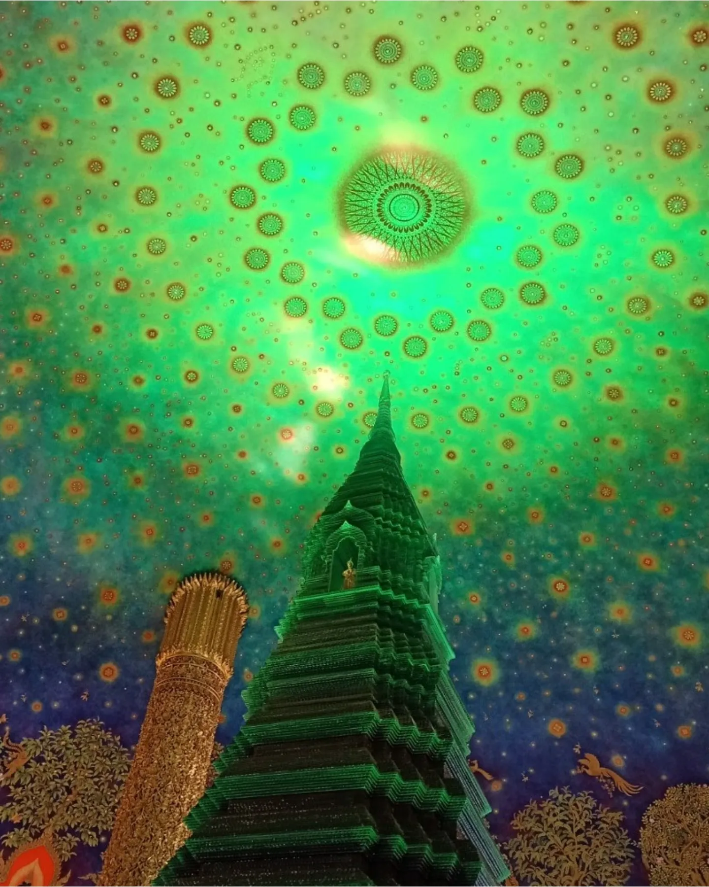 寺院の最上階の天井にはアートのような仏陀の生涯図が描かれており、息を吞むほどの美しさです。さらに、2021年には世界で最も高い約69mの黄金の仏像が完成しました。
