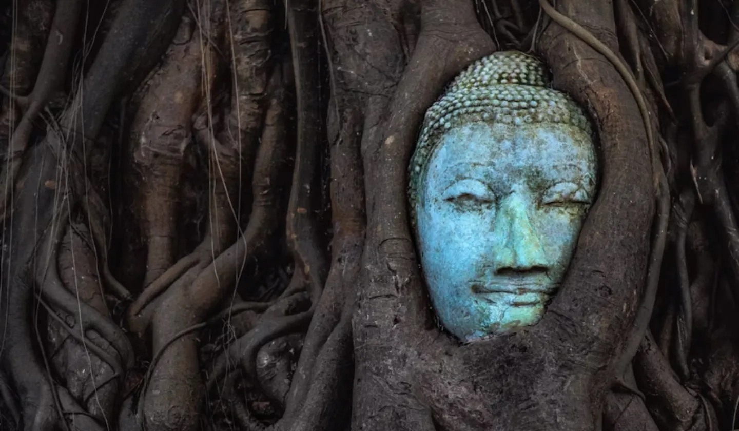 アユタヤ観光の紹介によく使われているのが、木の根に挟まれた仏像の頭部の画像です。これは、ビルマ軍によって切り落とされた仏像の頭部が地面に落ちて、菩提樹の成長とともに根元に取り込まれて現在の形になったと伝えられています。