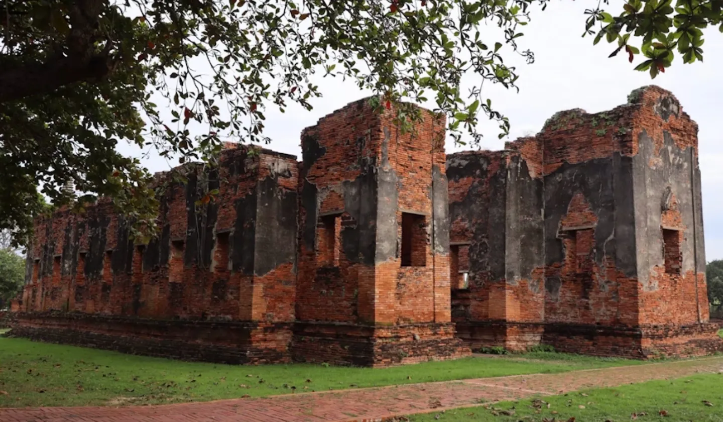 ワット・マハタートは、14世紀に建てられたアユタヤ王朝時代の重要な寺院のひとつ。かつては頂上で黄金の塔が輝いていましたが、現在では崩れ落ちたレンガの壁や礼拝堂の土台が残っています。