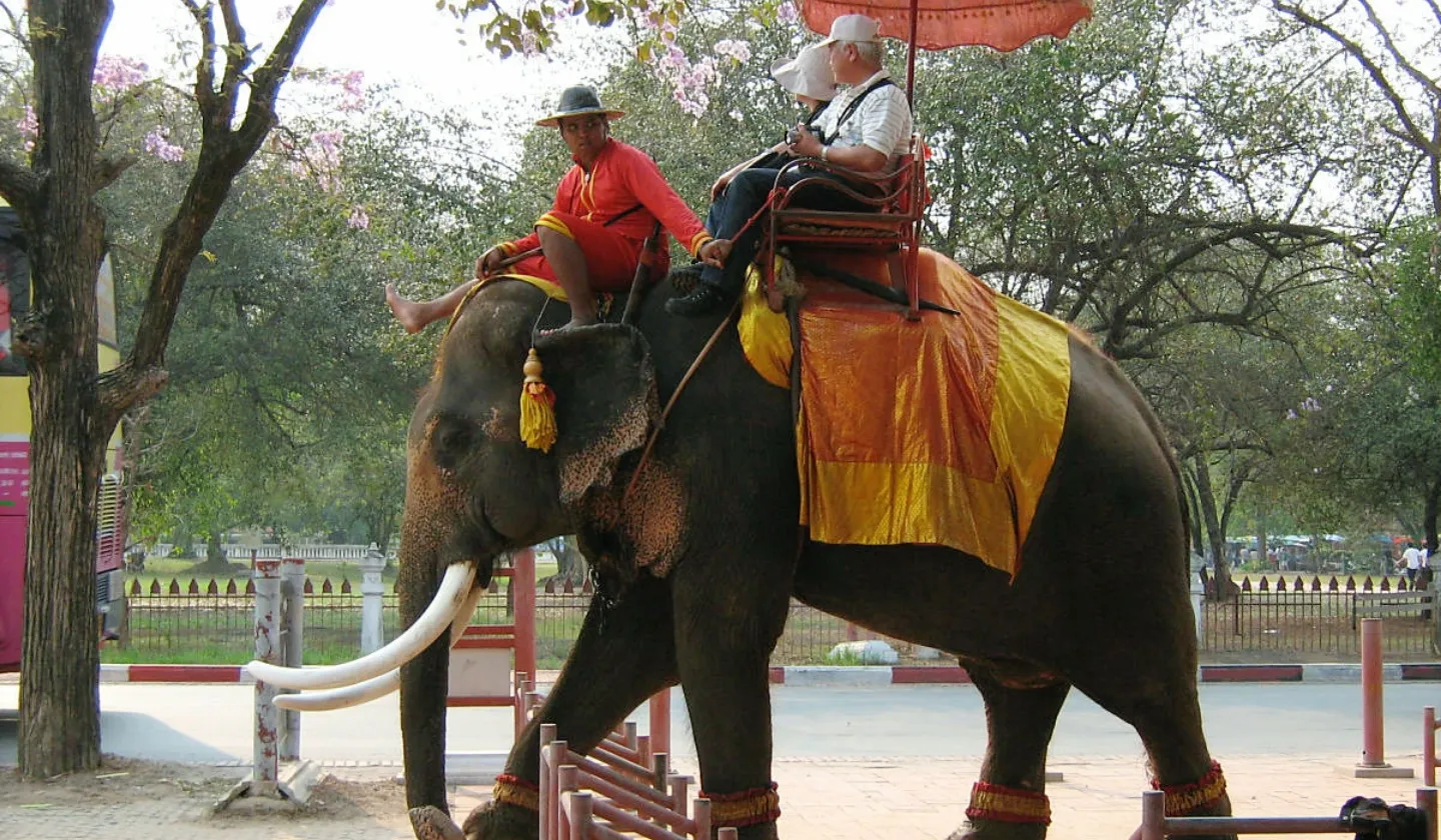 ゾウの背中から眺めるアユタヤの遺跡は、歩いて巡る時とはまた違った景色がみられます。