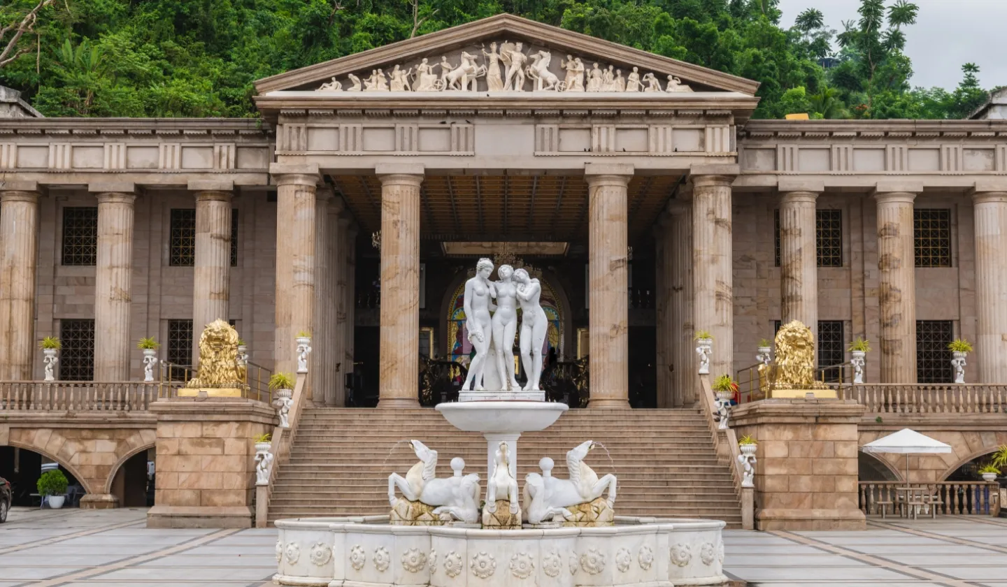 ヨーロッパ風の豪華な神殿様式の建築が特徴的で、ライオンや天使、剣闘士などの彫像が点在しています。セブ市街を見下ろす高台に位置するため、絶景ポイントとしても人気です。神殿の中心には約3メートルのレイアの銅像が置かれ、荘厳な雰囲気を醸し出しています。