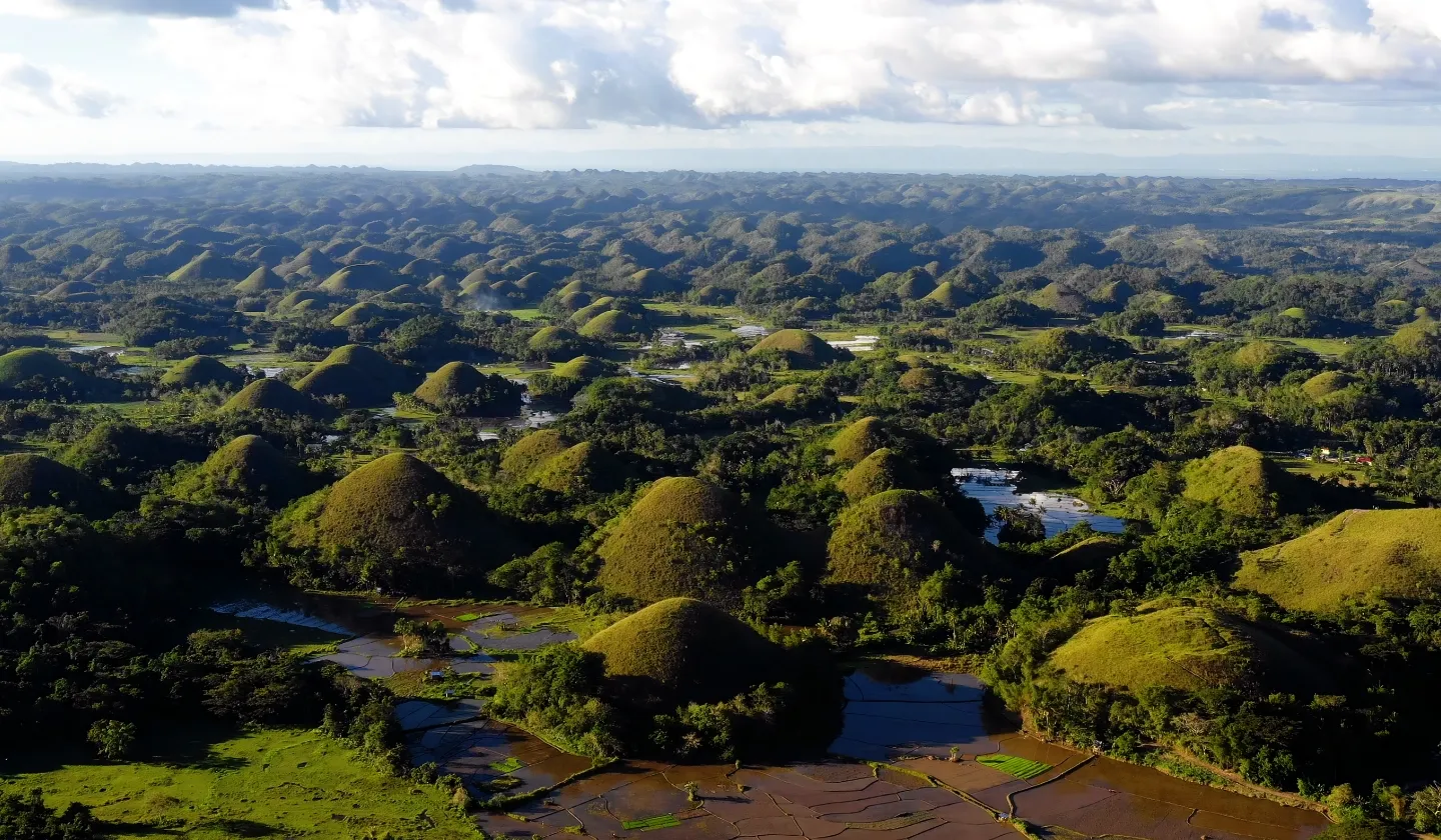 ボホール島は、セブ市内からフェリーで約2時間の場所にある、豊かな自然と独特の文化が魅力の観光地です。最大の見どころは、1,200以上の丘が連なる不思議な景観を持つチョコレートヒルズで、季節によって色が変化する様子は圧巻です。