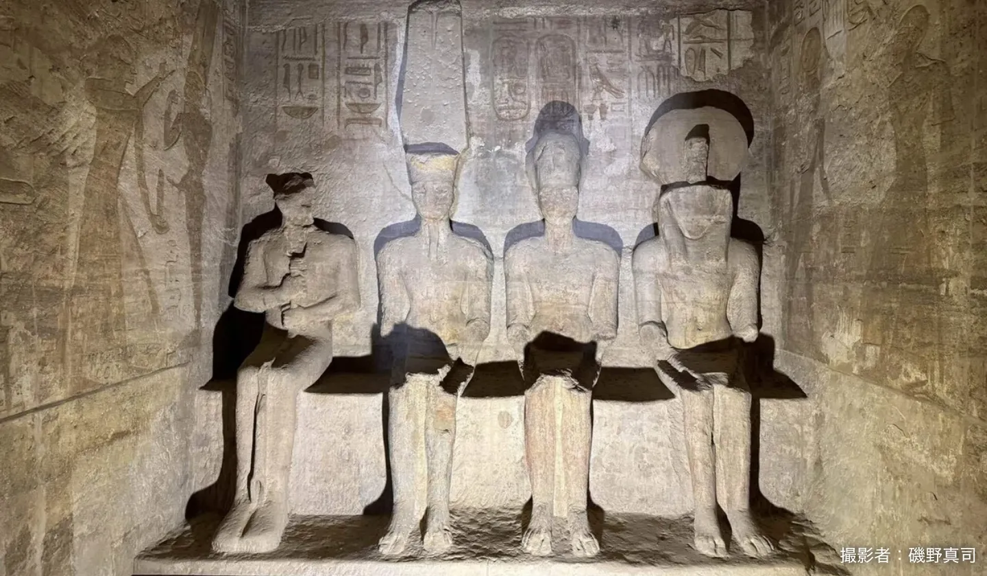 毎年冬至と夏至の日に太陽が大神殿の奥にある聖所に差し込み、そこの4体の像のうち3体に光が当たります。太陽の光が当たらない1体は左端のプタハ像で、生命の源の神であるため、光を浴びてエネルギーを補給し若返る必要がないからとされています。