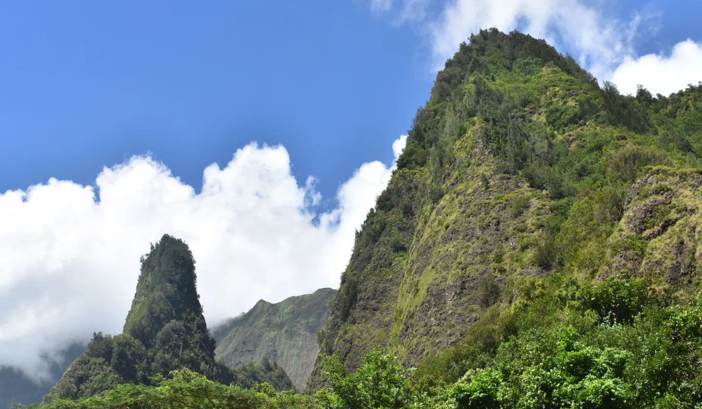 マウイ島の自然を存分に感じられるおすすめスポットのひとつ、イアオ渓谷州立公園。深い緑に覆われた山々と渓谷が広がり、川のせせらぎが響く静かな場所です。なかでも鋭く突き出した岩「イアオ・ニードル」は、このエリアを象徴する景観として知られています。