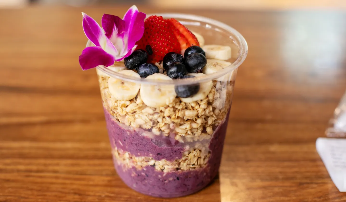 中でも人気のお店は、ワイキキの中心にあるロイヤル・ハワイアン・センター2階の「アイランド・ヴィンテージ・コーヒー」です。アメリカのスムージー系デザートは甘すぎると思われがちですが、ここのアサイーボウルは甘さ控えめで、店舗オリジナルのオーガニックグラノーラ、ハワイ産のオーガニックハニーなど、こだわりの食材が使用されています。苦手なフルーツやはちみつアレルギーがある場合は入れないように注文することも可能。新鮮なフルーツと食感のよいグラノーラとの相性は抜群です。