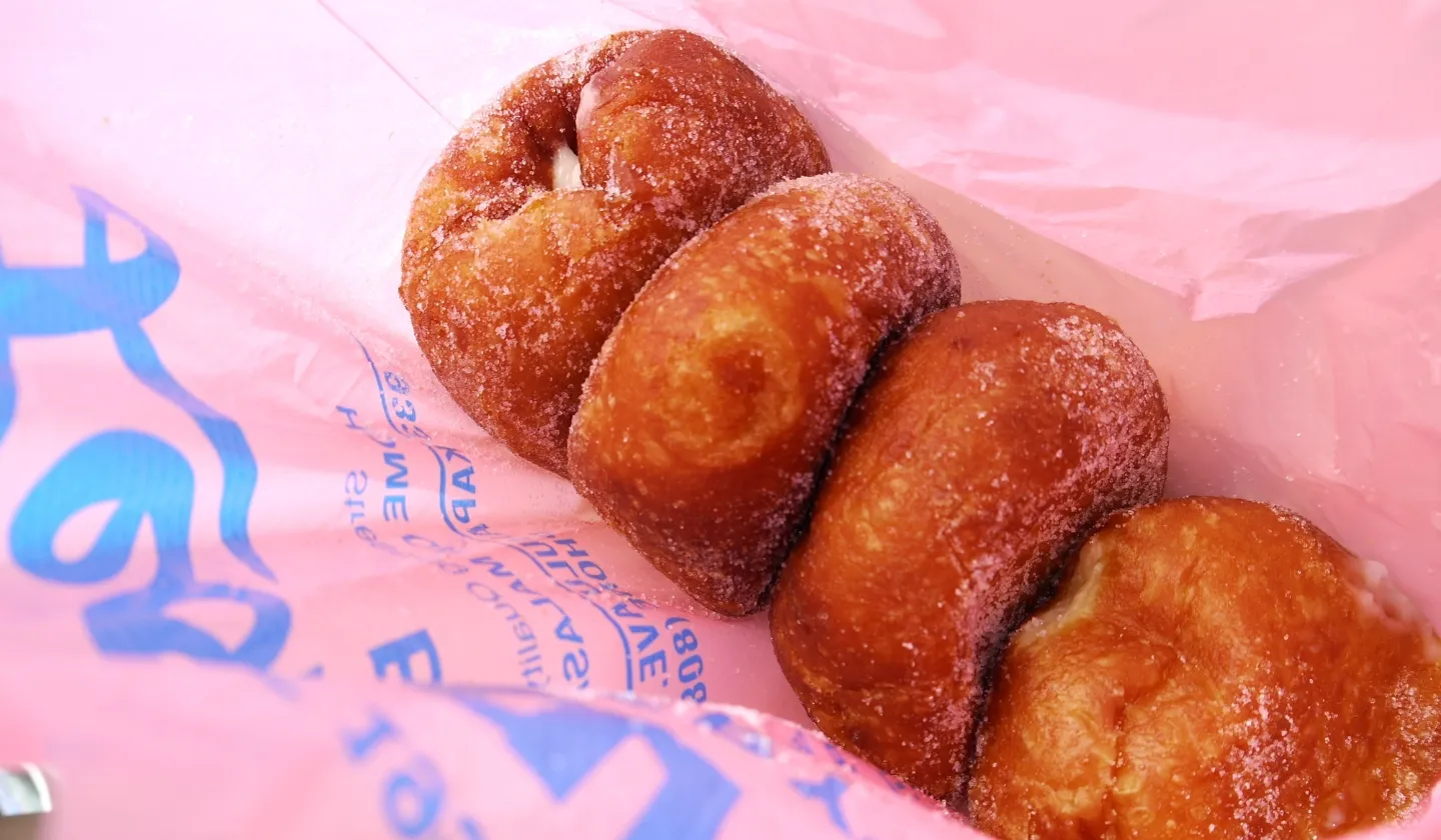 ハワイの代表的なデザートといえばマラサダ。ポルトガル発祥といわれている、砂糖がまぶされたシンプルな丸い揚げドーナツです。揚げたてはふわふわで、何個でも食べられるほど軽い食感が特徴です。