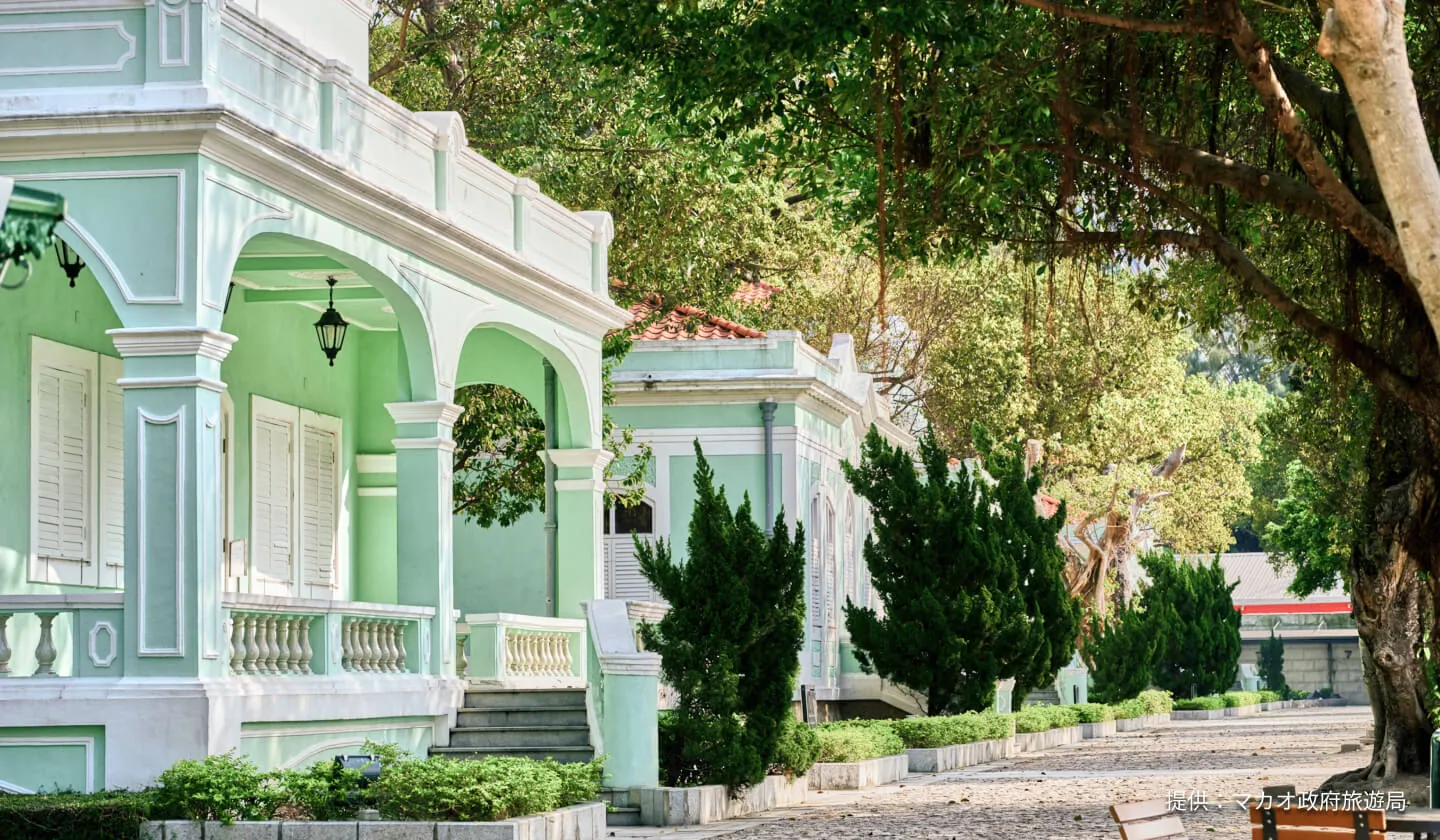 タイパビレッジから徒歩約5分のタイパハウスミュージアムは、コタイ地区を臨む人工湖の前にエメラルドカラーのコロニアル風建築が並ぶ風光明媚な穴場スポットです。ジャッキー・チェンの映画「プロジェクトA」などのロケ地になった場所なので、映画ファンの方は足を延ばしてみてはいかがでしょうか?