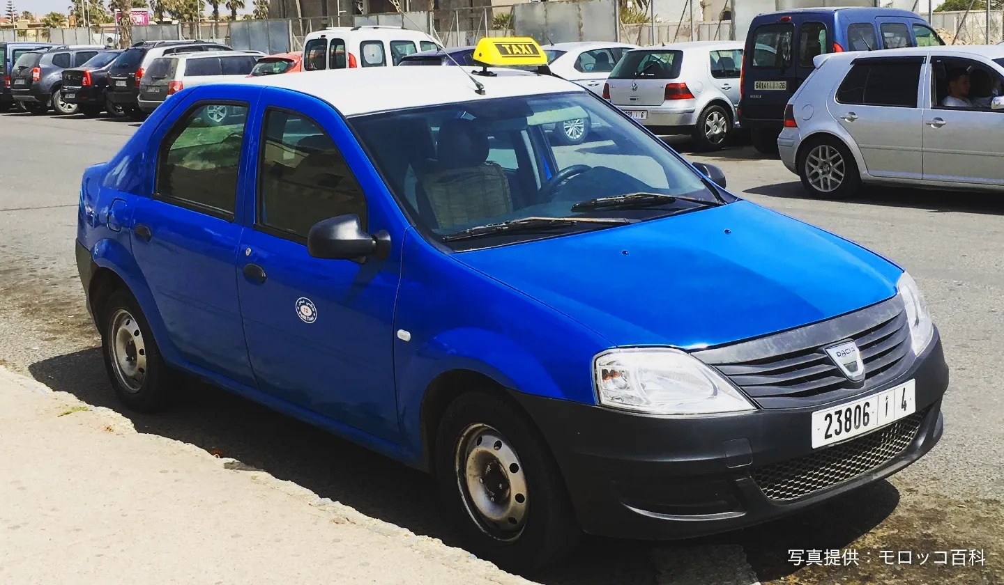 各都市によって異なるタクシーの色。エッサウィラはブルーの車体に白い屋根