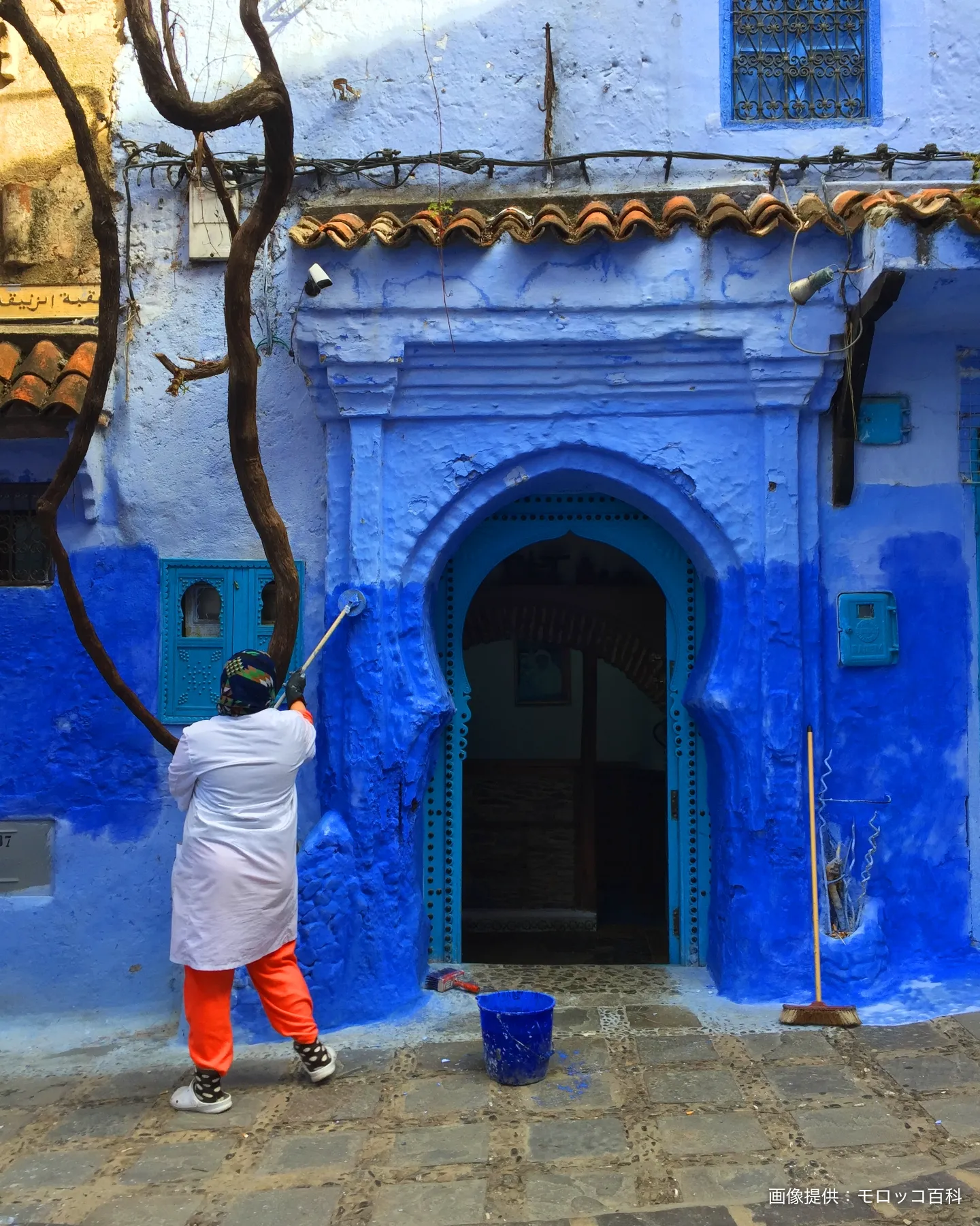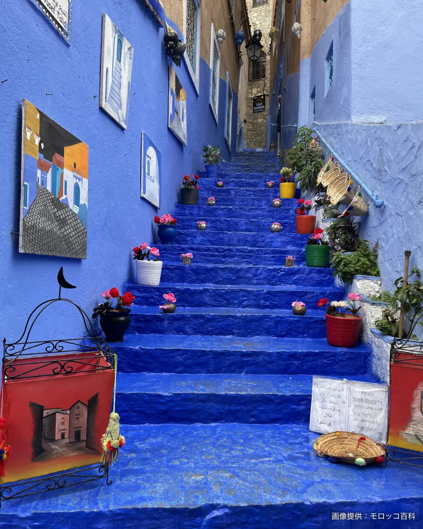 シェフシャウエンのメディナの中心となる広場。グラン・モスクを背にウタ エル ハマン広場に立ち、見上げるとSNS映えすることで有名な青いシェフシャウエンの町並みが広がっています。カフェ、レストラン、お土産店が軒を連ね、所々で青の街に溶け込んだ猫たちを目にすることでしょう。マラケシュやフェズに比べるとお土産店の客引きは控えめ。ただし、同じような雑貨でも価格は高めです。