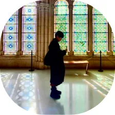 コンサートホールの天井中央には、太陽を表すステンドグラスの天窓があり、自然光が降り注ぐ幻想的な空間を生み出します。天使や花々が色鮮やかに輝き、まるで音楽と光が融合した世界に包まれているようです。