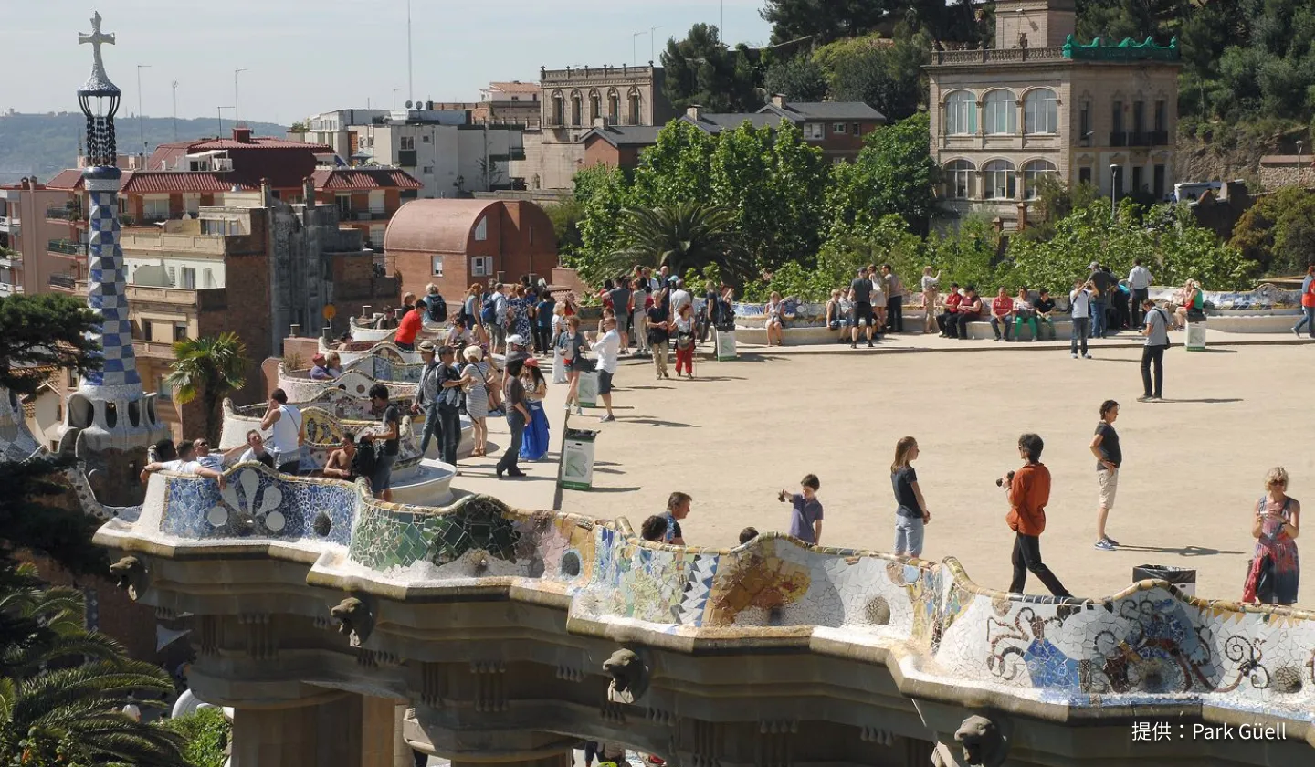 入り口に並ぶ「お菓子の家」は、まるで童話の世界そのもの。ホイップクリームのような屋根やクッキーを思わせる外壁が、訪れる人を温かく迎えてくれます。壊れたタイルの破片を再利用したモザイク装飾が階段を彩り、中央では虹色のトカゲ像(エル・ドラック)がお出迎え。頂上の波打つベンチからは、バルセロナの街並みと地中海を一望できます。