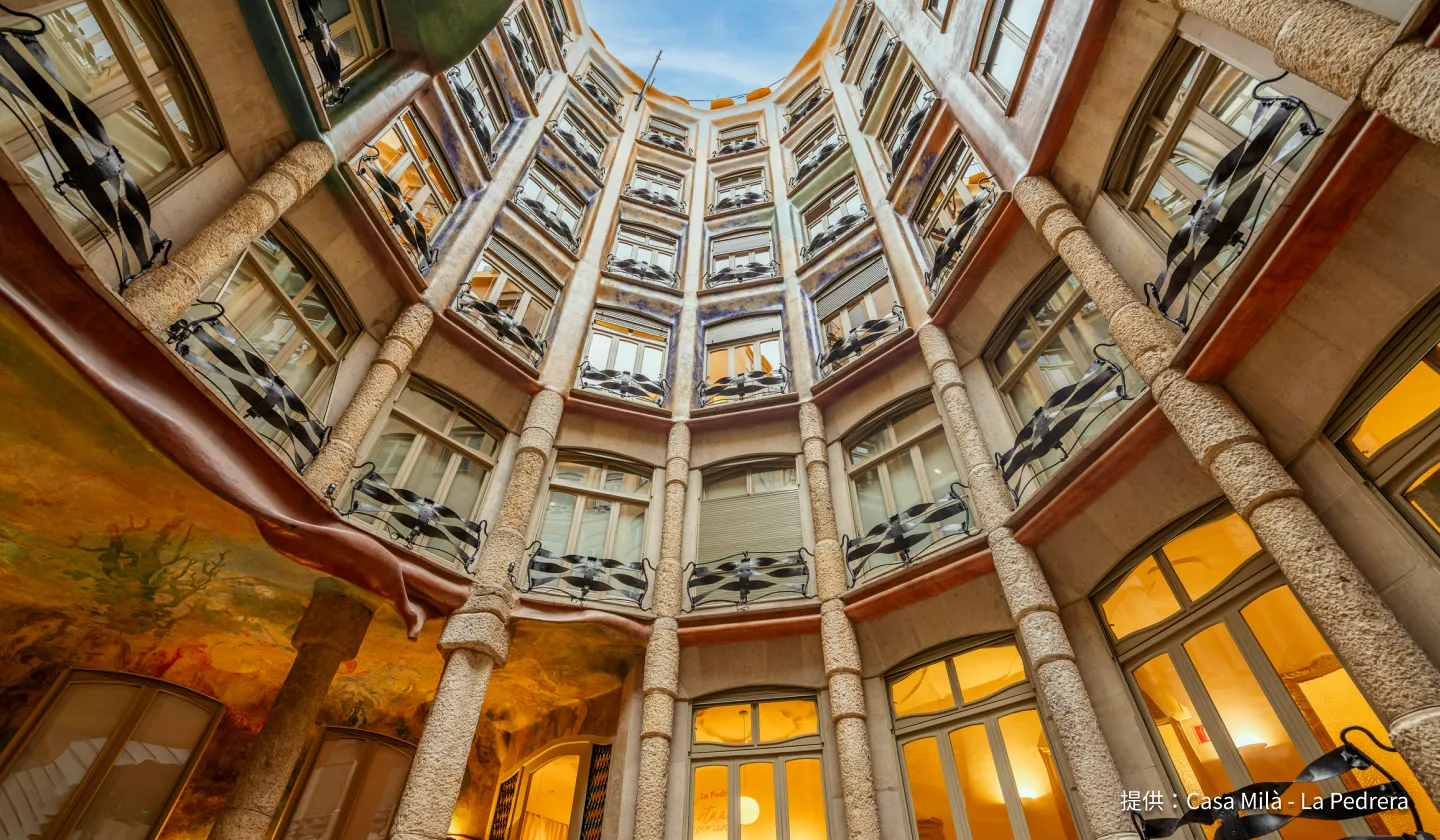直線がひとつもない外観は、まるで地中海の波のようにうねり、ガウディらしい有機的な美しさを放っています。革新的だったのは、柱だけで建物を支える構造。壁を自由に配置でき、大きな窓から光が降り注ぐ明るい空間が生まれました。屋上に並ぶ彫刻のような煙突群は、まるで兵士のようにバルセロナの街を見守っています。