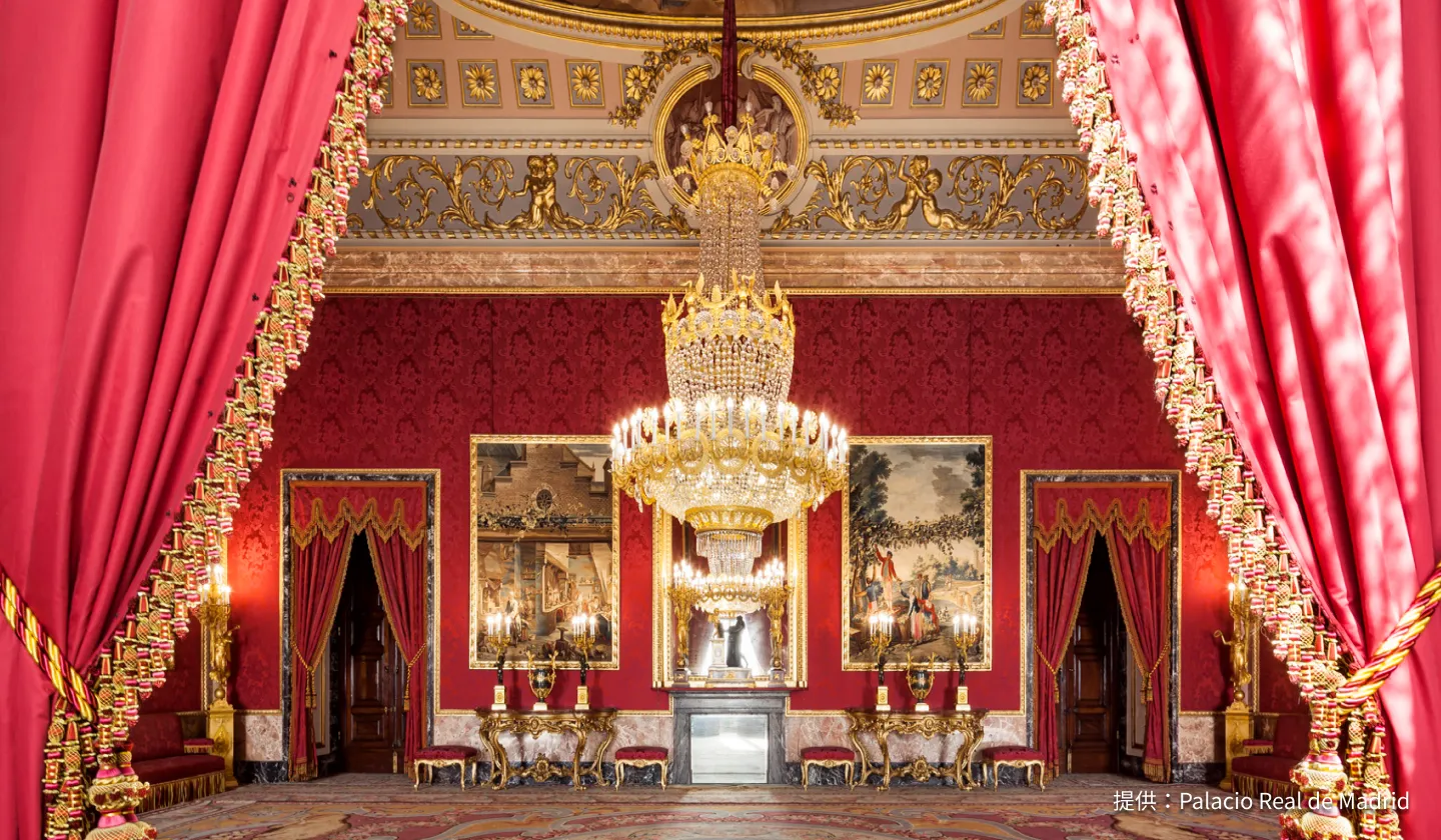 宮殿内部はまさに豪華絢爛。18世紀の画家たちが描いた天井画が彩りを添え、フェルナンド7世が収集したクリスタルのシャンデリアがきらめきます。