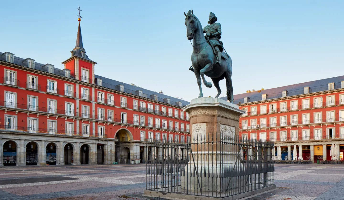 広場を囲むのは114のアーチと377のバルコニー。北側の「パン屋の館」には、かつて王族が行事を見物した特等席が残っています。広場の中央に立つフェリペ3世の騎馬像は、闘牛や宗教行事、時には処刑まで、400年以上にわたる広場の歴史を静かに見守ってきました。