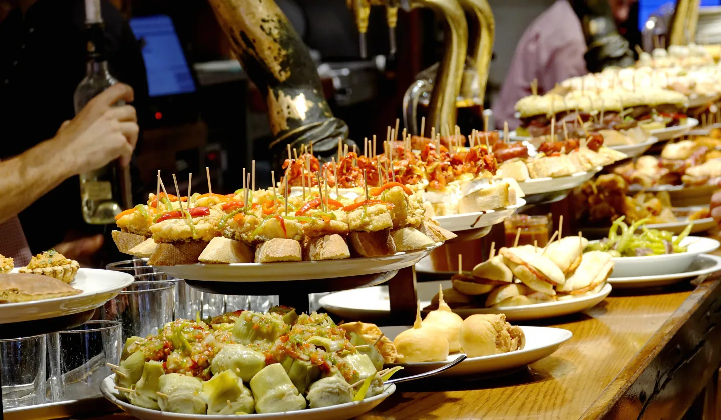 サン・セバスティアン旧市街のバルに足を踏み入れると、カウンターいっぱいに色とりどりのピンチョスが並ぶ圧巻の風景が広がります。イベリコ生ハムとマンチェゴチーズの定番から、フォアグラにリンゴのコンポートを組み合わせた贅沢な一品、さらにバカラオ(塩鱈)のクリーム煮をパイに包んだ伝統料理まで、そのバリエーションは実に豊富です。