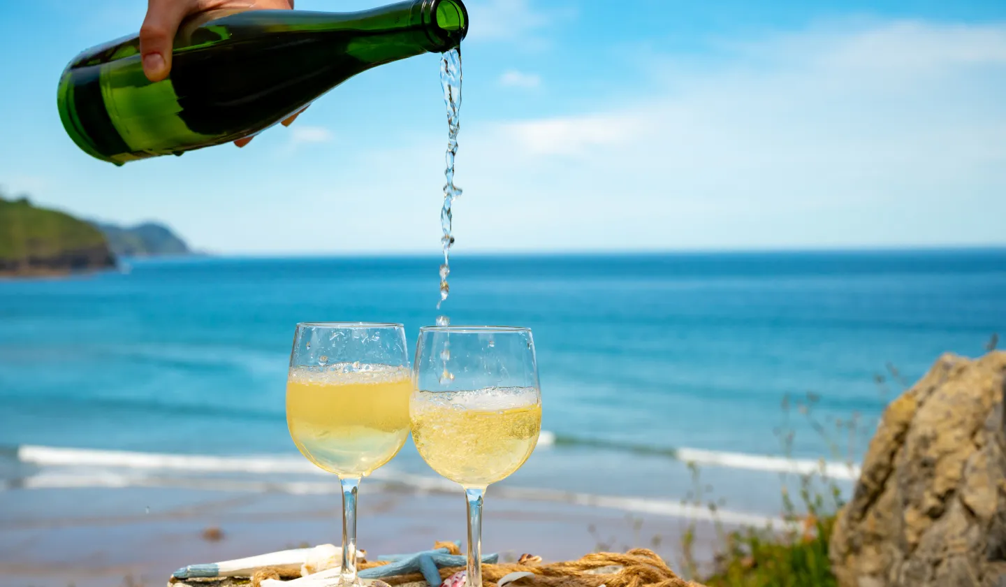 ビスカヤ湾を望む丘陵地帯で、海風をたっぷり受けて育ったブドウから造られるのがチャコリです。わずかに発泡し、爽やかな酸味が心地よく、アルコール度数も控えめ。腕を高く上げて注ぐ独特の作法「エスカンシア」は、微細な泡を立たせるための伝統ですが、品質向上により、最近では通常の注ぎ方をする店も増えています。