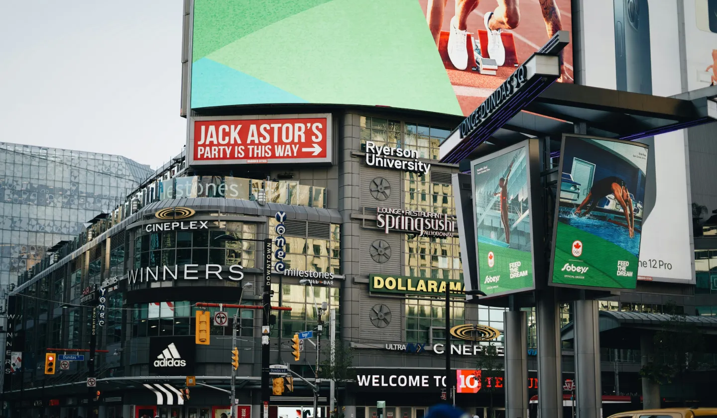 トロントのダウンタウン中心部にある交差点、ヤング・ダンダス・スクエアは、地元の人にも観光客にも人気の場所で、トロントらしい活気と多文化の空気が入り混じった場所になっています。