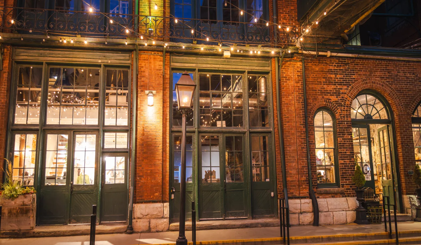 ディスティラリー・ディストリクトは、19世紀に建てられたウイスキーの醸造所跡地を再開発して誕生した歴史地区で、赤レンガの建物と石畳が情緒ある雰囲気を作り出しています。おしゃれなギャラリーやブティック、個性的なレストランやカフェが並んでいて、ヨーロッパにいるような気分で散策できる場所です。