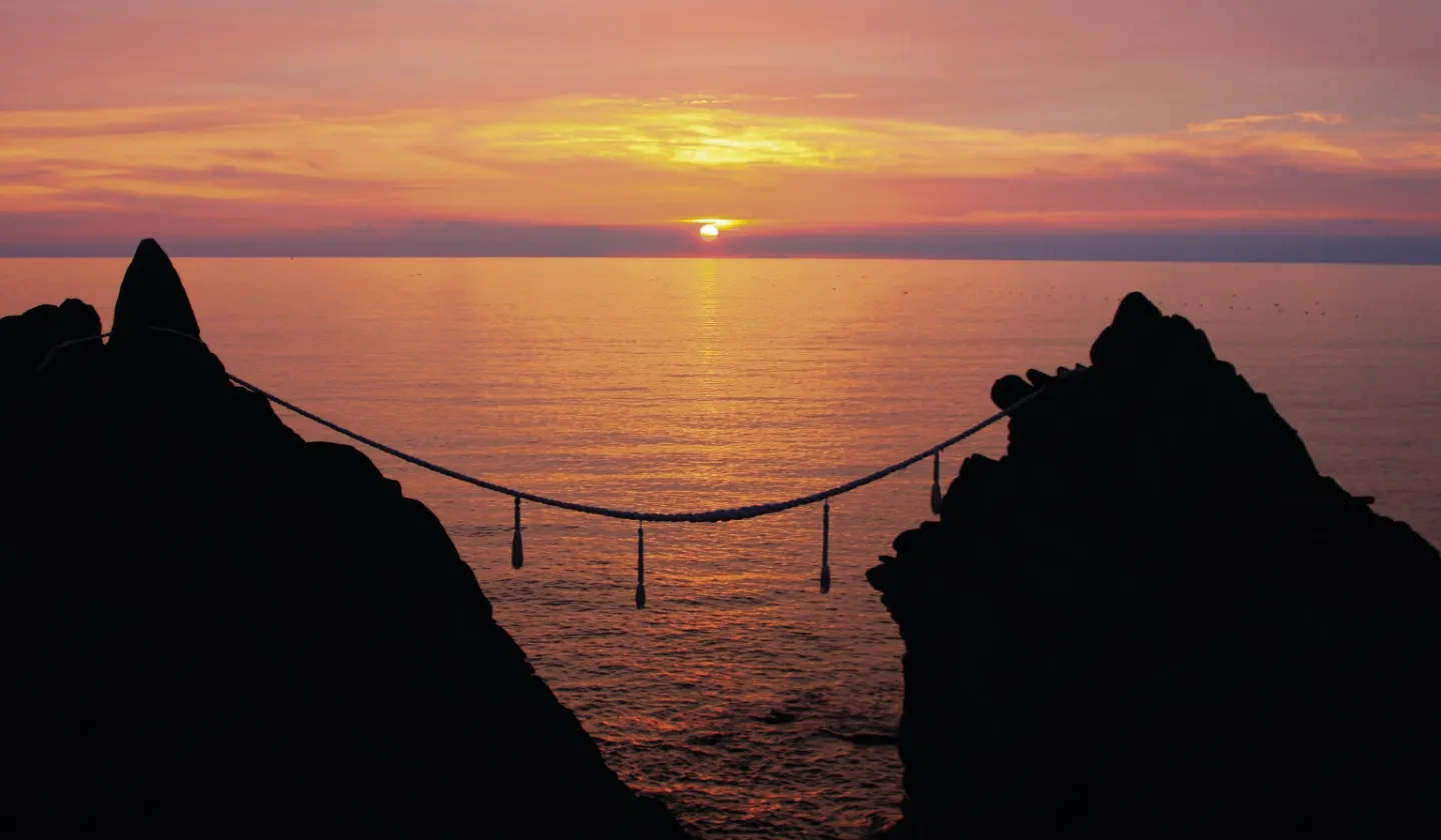 諸説ありますが、ある嵐の夜にがけ崩れにあって海に投げ出された夫婦の生まれ変わりという言い伝えのある岩です。角がふたつある岩が雄龍、ひとつの方が雌龍とされています。東シナ海に沈む夕日が美しく、絶景スポットとして人気です。