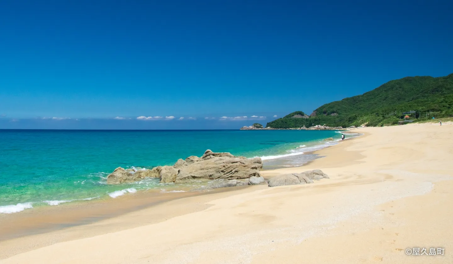 真っ白な砂が美しい白浜が約1kmにわたって続いている永田いなか浜。この白浜は、屋久島の奥岳から永田川の流れに乗って運ばれる花崗岩(かこうがん)の白砂です。天気のよい日は、白浜から見渡せる青い海と澄みわたる空、夕暮れ時はサンセットがなんとも美しく輝きます。また、太平洋一円を回遊しながら生活するウミガメが産卵のために上陸する日本一のウミガメの産卵地としても知られています。