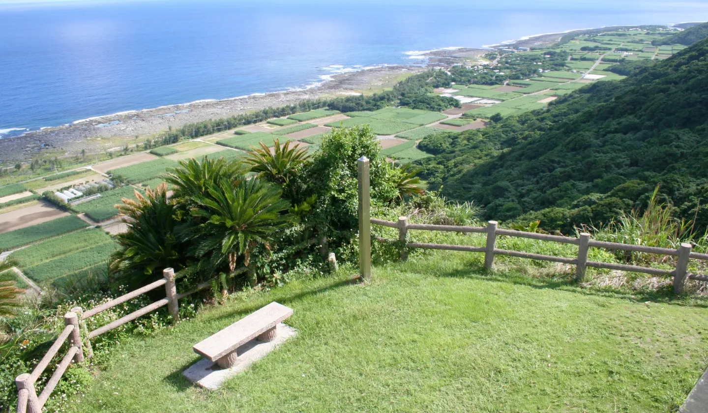 約200mにもおよぶソテツトンネルを歩いた先にある、金見崎展望台です。眼下にはソテツの群生林が広がり、太平洋と東シナ海を同時に見渡せる大パノラマ。天気のよい日には、水平線に浮かぶ加計呂麻島や与路島などの島影を見つけることができます。