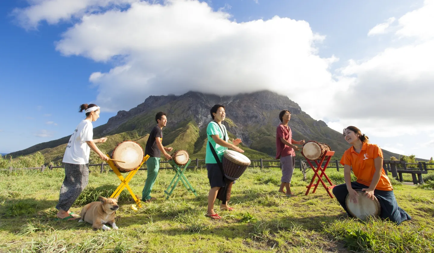 硫黄島をバックにジャンベなどの演奏を楽しむ人々
