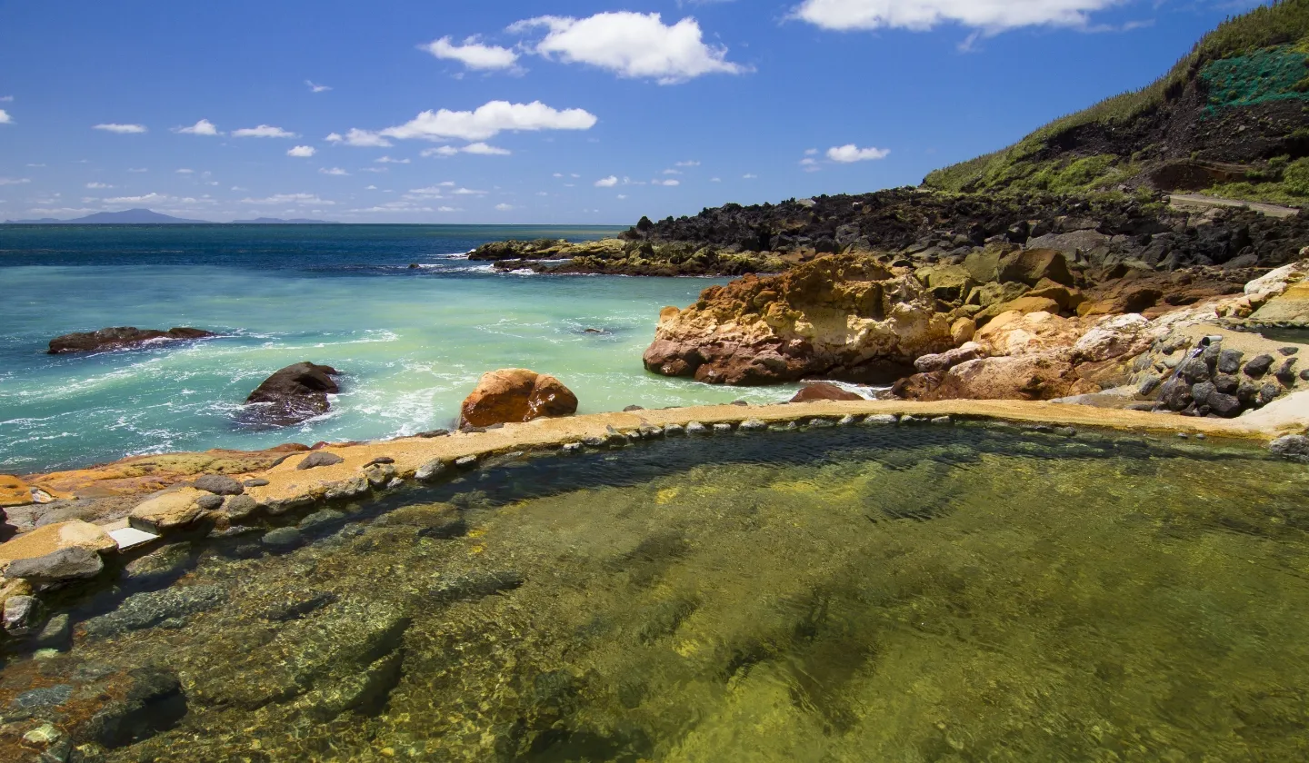 硫黄島ならではの海の楽しみ方のひとつ、温泉。白波が打ち寄せる岩場に湧き出した東温泉は、硫黄岳の岩石の成分の中のアルミニウムなどを多く溶かし込んだ泉質で、海に流れ出すと海水と反応して乳青色に変化します。また、その泉質は日本でも稀有で、美肌効果も期待できるそう。硫黄岳をバックに温泉に入りながら東シナ海を眺めてみませんか?