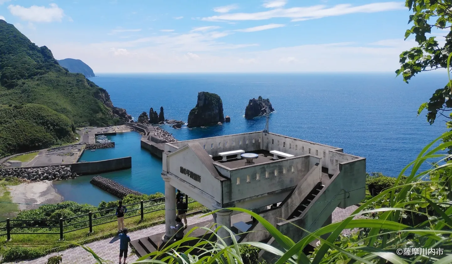紺碧の東シナ海と、下甑島のシンボル・ナポレオン岩を望むことができる展望台です。背後には、瀬々野(せせのうら)の集落があり、この瀬々野浦地区は、漫画「Dr.コトー診療所」の診療所のモデル地でもあり、原作の世界観が感じられるとあって多くのファンが訪れています。