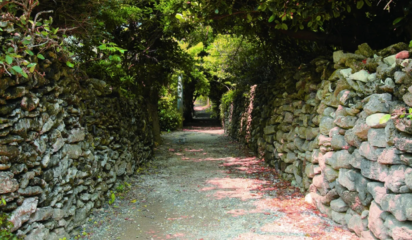 小さな集落の入り口にある珊瑚礁の石垣です。どこか懐かしく感じられ、木漏れ日が何とも言えない心地よさ。ハイビスカスが咲く時期は、より南国らしく、撮影スポットとしても人気です。集落の通りですので、車で移動する際は徐行運転で。