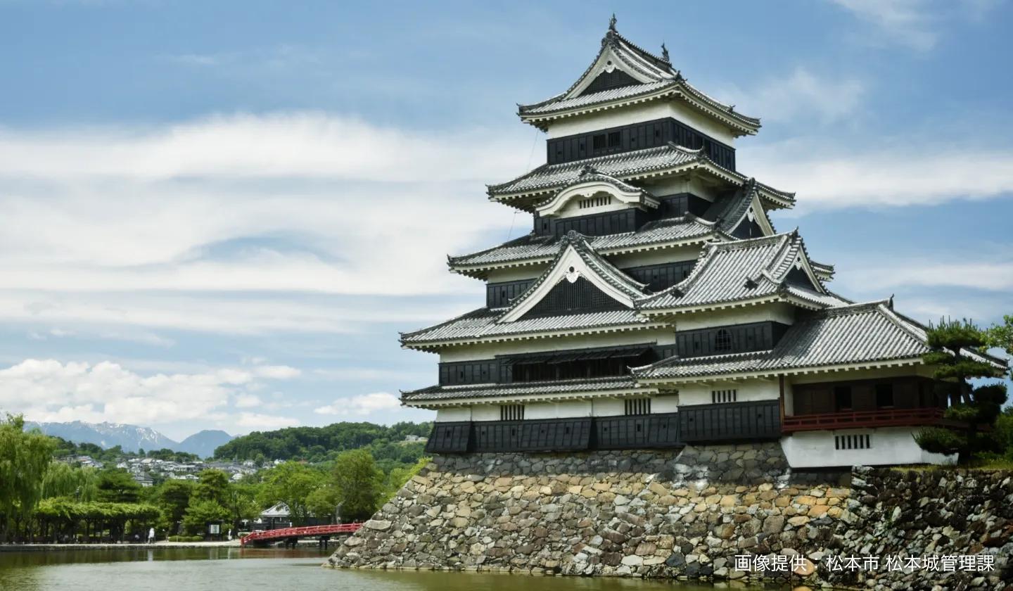アルプスの山々を背景に、黒と白のコントラストが映える「国宝 松本城」。鏡のように、堀の水面が天守を映す姿は見事です。日本において、かつての状態のまま天守が残る「現存天守」はわずか12城。松本城はそのうちのひとつです。