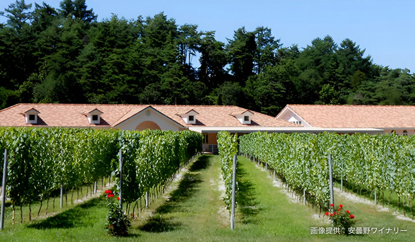 森の中のぶどう畑に囲まれたワイナリーです。安曇野ワイナリーが目指すのは「テロワール(※)を存分に感じられるクリアなワイン」。収穫したブドウの味や香り、風味がそのまま薫るワインを醸します。開放感のあるテラス席では、ブドウの生育の様子を間近に見ることができます。