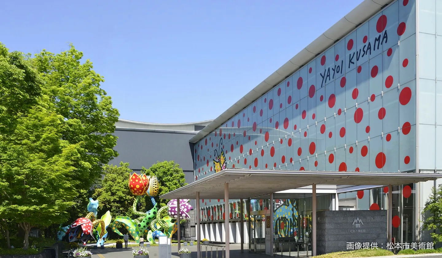 信州ゆかりの作家の常設展示のほか、随時企画展示が開催される美術館。まず圧倒されるのは、玄関横に野外展示される「幻の華」です。この作品は、松本市出身の前衛芸術家である草間彌生の作品であり、美術館のシンボルでもあります。常設展示室では、多くの草間彌生の作品が展示されており、彼女の世界に没入できる空間です。