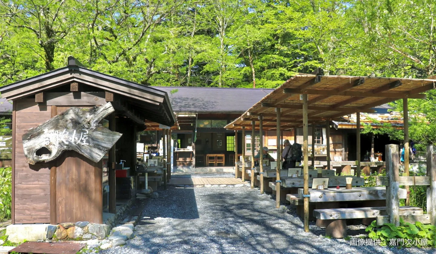 明神池・穂高神社奥宮の参道脇に構える「嘉門次小屋」。日本近代登山の父と呼ばれるウォルター・ウェストンの山案内人として知られる上條嘉門次が、小屋を建てたのが始まりです。それ以降、宿泊や食事ができる山小屋は、古くから上高地の憩いの場として親しまれています。