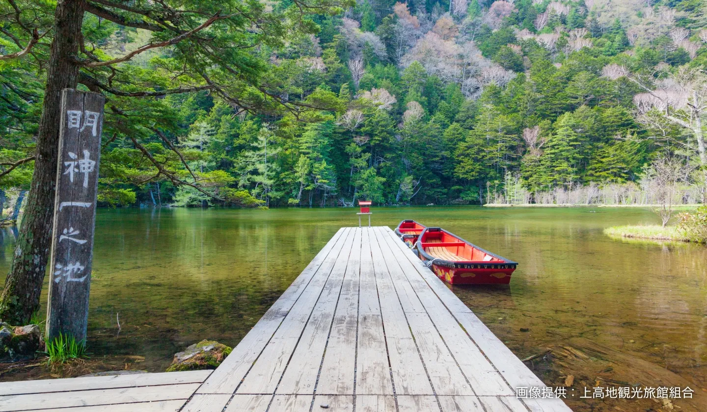 河童橋から遊歩道を歩くこと約1時間で到着するのは「穂髙神社奥宮」にある「明神池」。付近は古くから、神合地、神垣内、神河内(読み方はすべて「かみこうち」)などとも呼ばれ、神々を祀る神聖な場所とされてきました。明神池はカラマツの森に囲まれ、目の前にそびえるのは「明神岳」の最南峰。その神秘的な姿が印象的です。