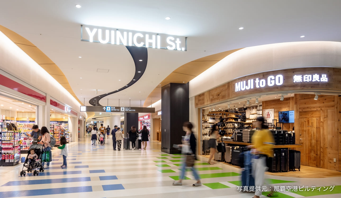 那覇空港内には、沖縄ならではの商品を取り扱うショップがたくさんあり、見て回るだけでも楽しめます。特に、国内線エリアと国際線エリアをつなぐ「YUINICHI St(ゆいにちストリート)」には、「プレミアムな沖縄」を感じられるお土産も揃っていますよ。保安検査後のエリアには免税店もあります。