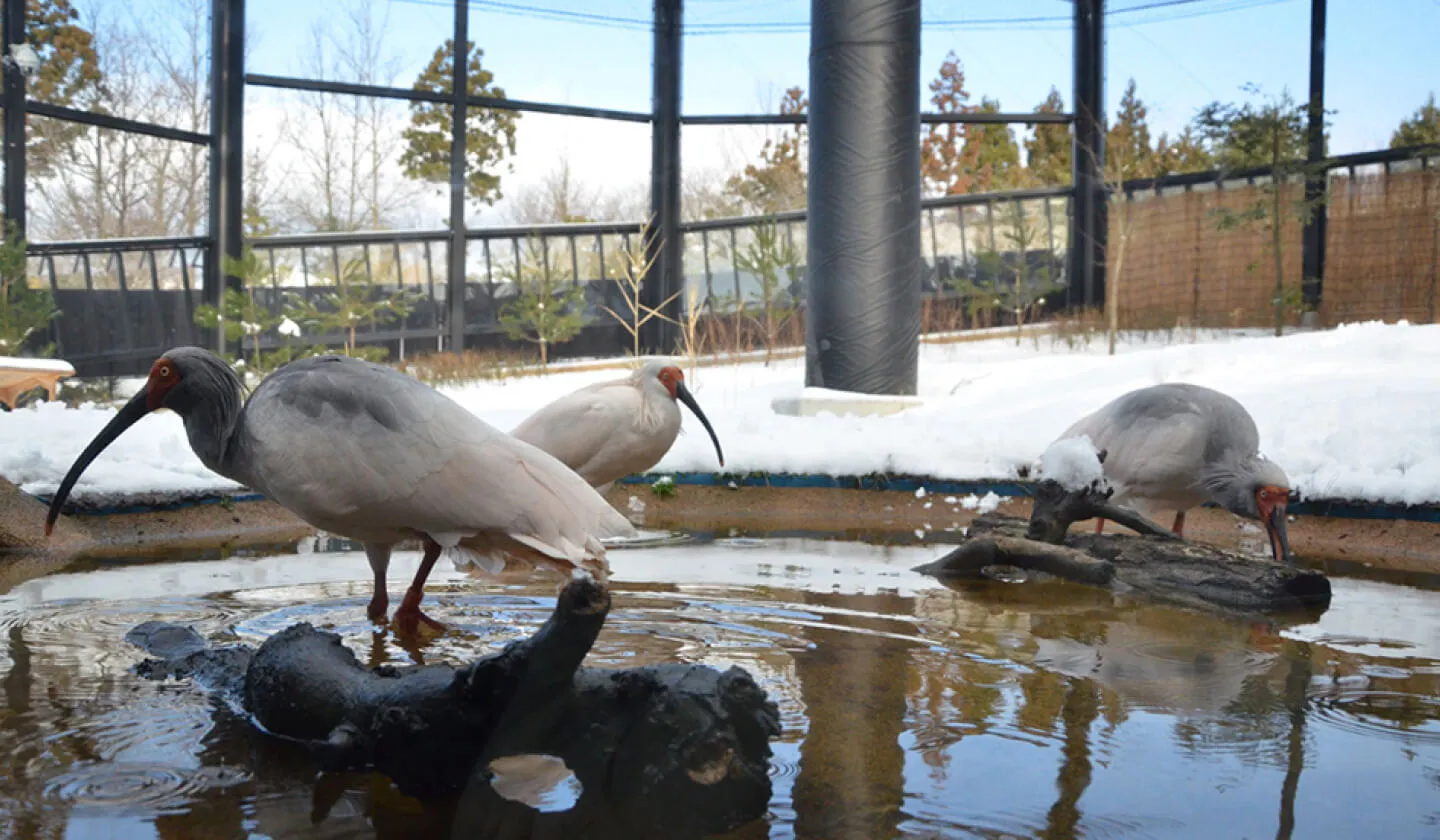 公園内には、ガラス張りの観察ケージがあり、運がよければ優雅に飛ぶトキの姿を見ることができます。また、羽を広げた際の美しい淡いピンク色や、特徴的なくちばしの形など、実際に観察することでトキの魅力をより深く感じることができます。