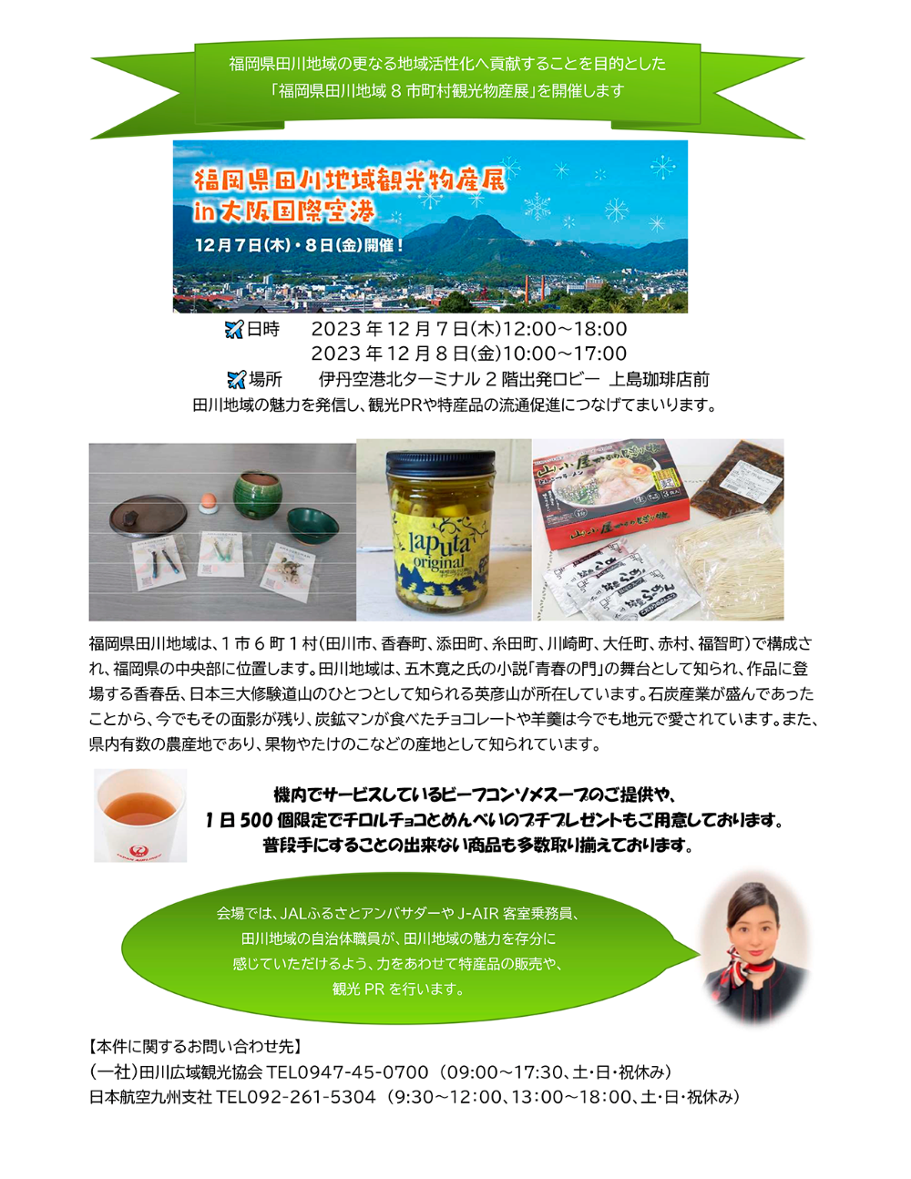 福岡県の中央部に位置する1市6町1村(田川市、香春町、添田町、糸田町、川崎町、大任町、赤村、福智町)で構成される田川地域。その魅力をPRするためJALふるさとアンバサダーやJ-AIR客室乗務員、田川地域の自治体職員が、特産品の販売や観光PRを行います。