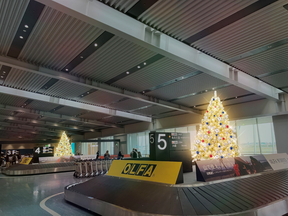 飛行機でご到着のお客さまのみご利用いただける手荷物受取所では、ご到着のみなさまをクリスマスツリーがお迎えします。